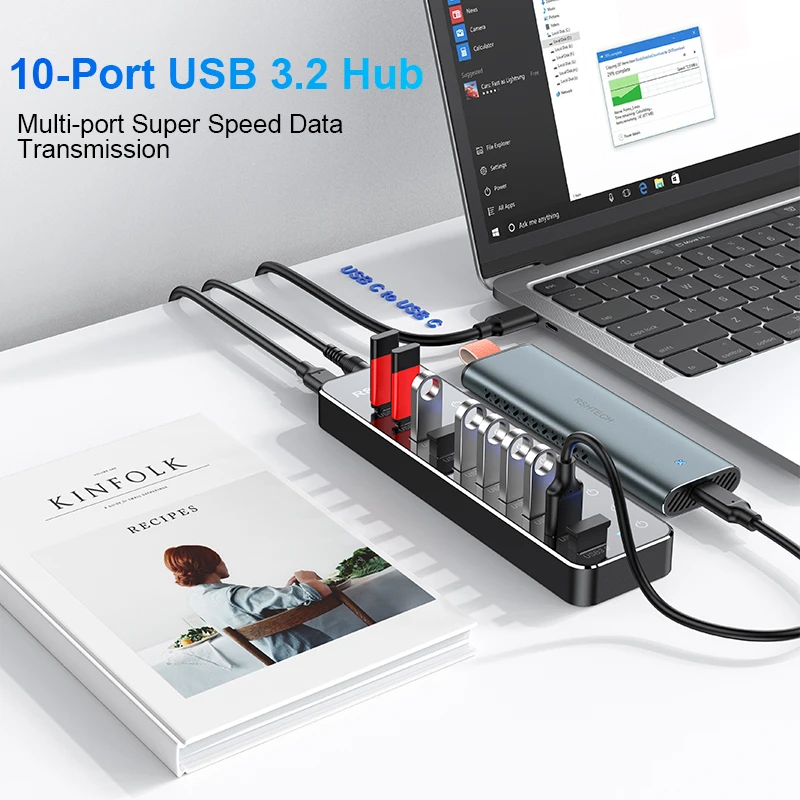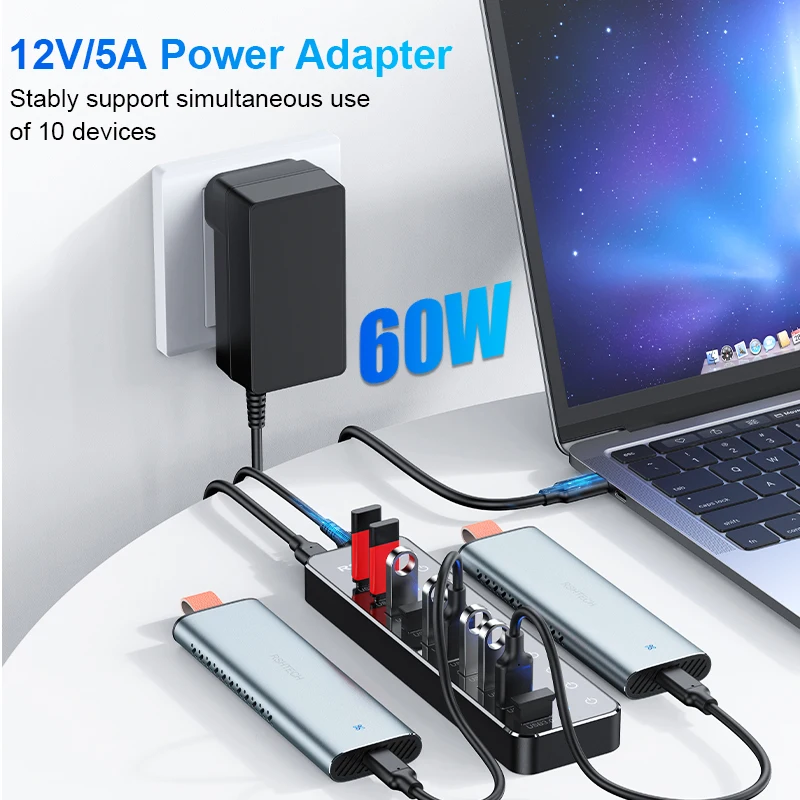 Hybrid 10-Port Powered USB Hub:Equipped with 7 x USB-A 3.0 ports, 2 x USB-C 3.2 Gen2 & 1 x USB-A 3.2 Gen2 data ports. The 10-port USB hub helps you solve the problem of insufficient USB ports on your computer.